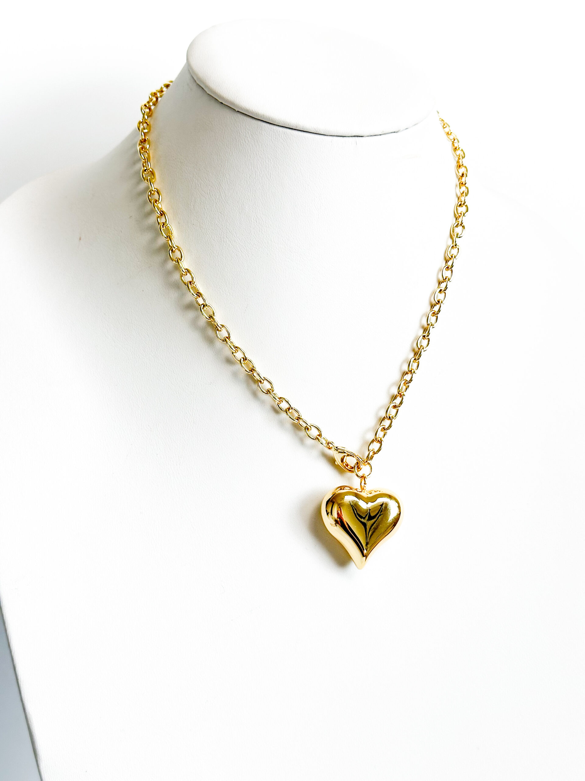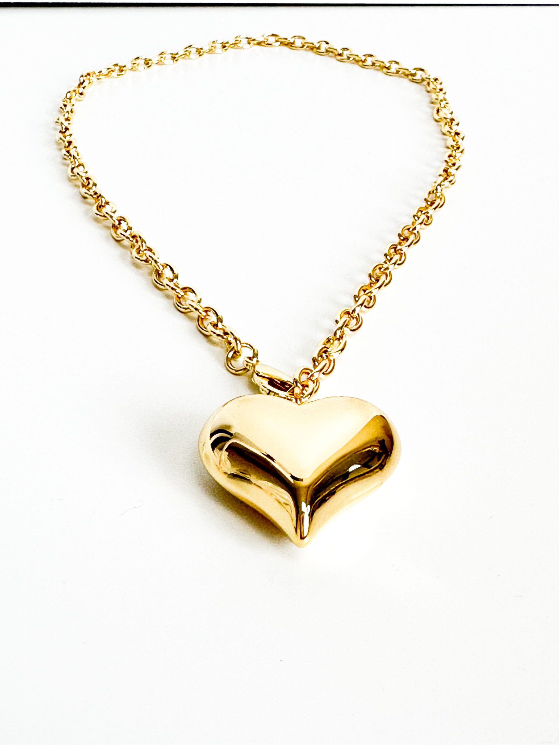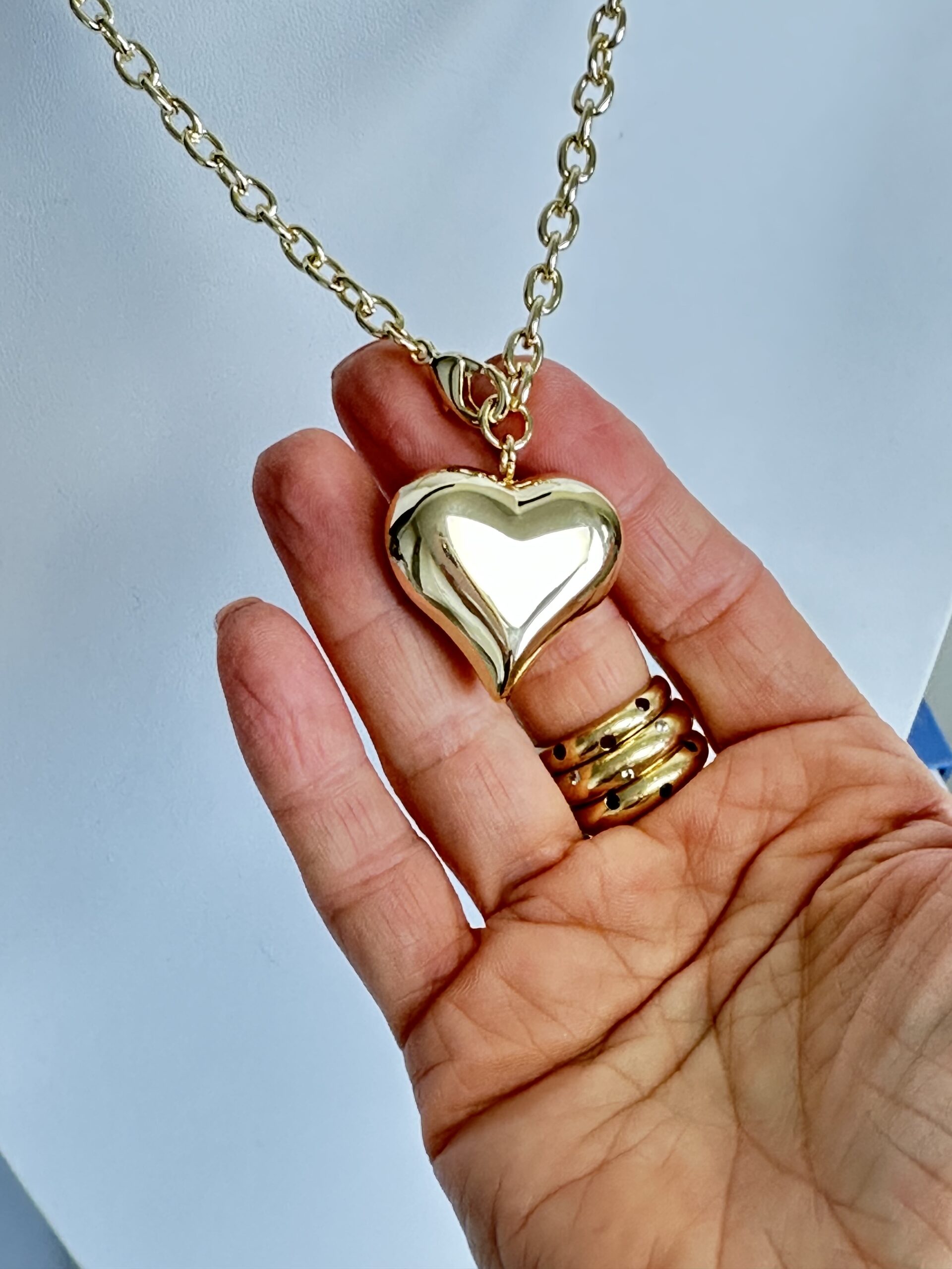 Make a boldĀ yet romantic statement with the gold puffy heart necklace. This eye catching piece features a lustrous, puffed heart charm suspended from a classic gold chain. The chunky link adds a modern edge, while the smooth, polished finish of the pendant brings a soft, elegant touch. Perfect for layering or wearing solo, it’s the ultimate accessory for those who love to wear their heart in style!