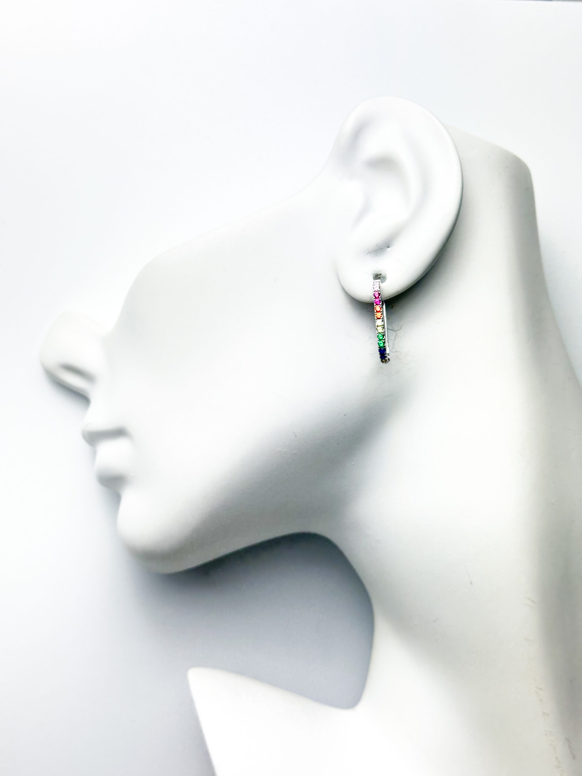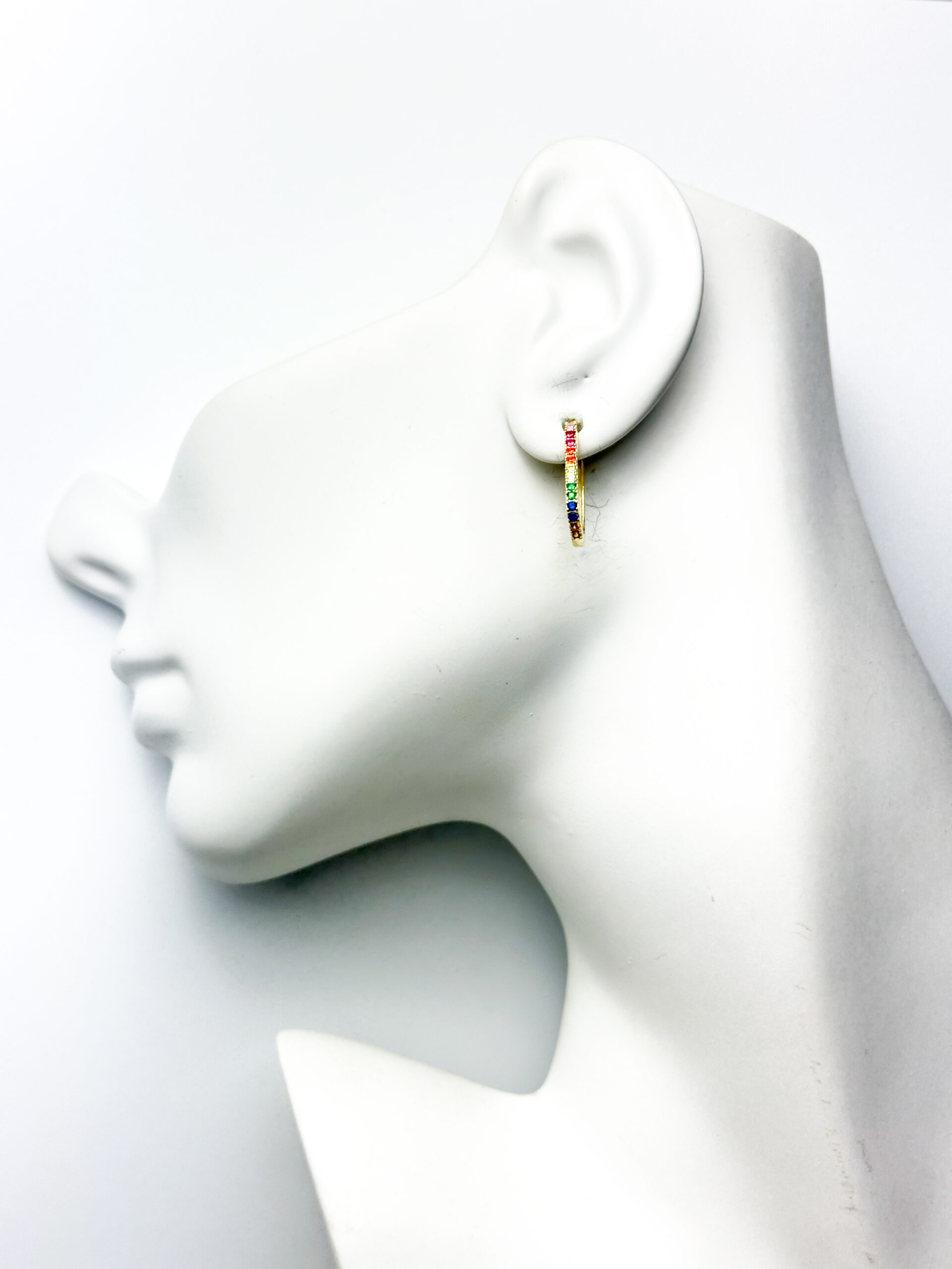 Add a pop of color to your everyday look with these stunning rainbow hoop earrings. Available in both gold and silver, each hoop is adorned with a vibrant gradient of multicolored gemstones. Lightweight and elegant, the rectangular shape makes them perfect for stacking or wearing solo for a subtle yet playful statement.